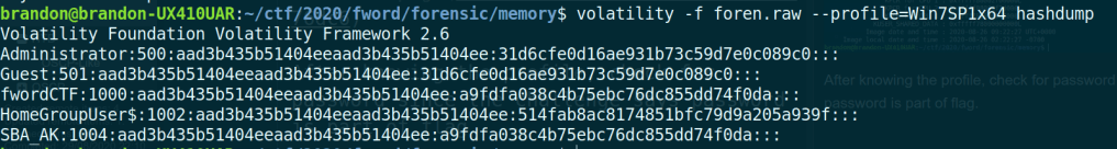 volatility -f foren.raw --profile=Win7SP1x64 hashdump