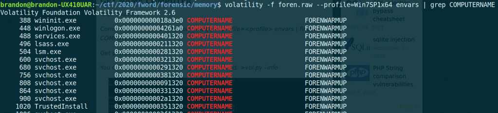 volatility -f foren.raw --profile=Win7SP1x64 envars | grep COMPUTERNAME
