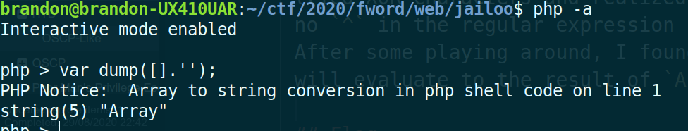 Then the code calls eval, which evaluates the string as PHP code. So if no letters or numbers are allowed, what else can I do? I tried XOR characters and realized there is no ^ in the regular expression string. After some playing around, I found [].'' will evaluate to the result of 'Array'.