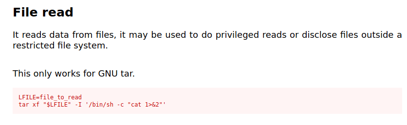 Next is to figure out how I can read file with tar. Luckily I can find it on gtfobin.