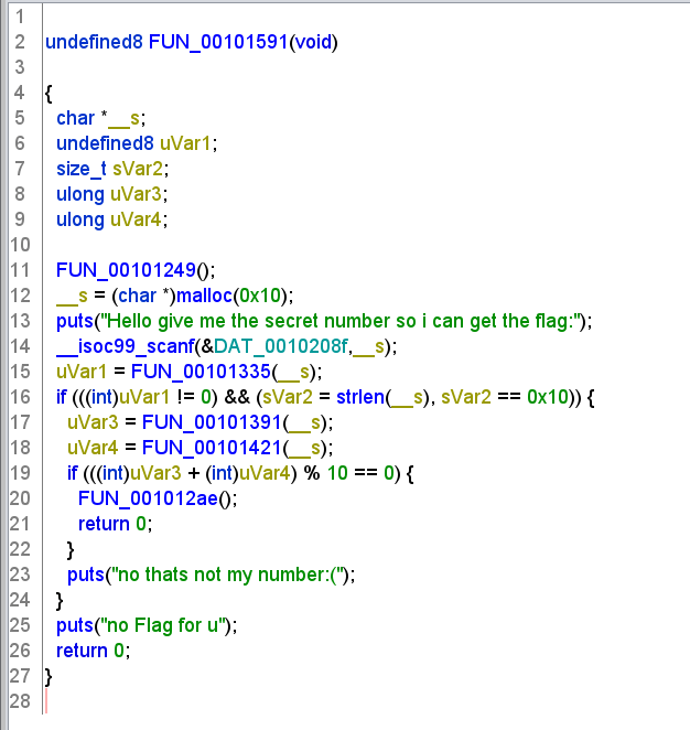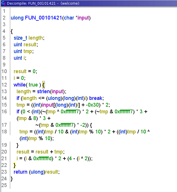 The program logic is rather clear, it takes input, does some checks, if it passes all checks then I will get the flag. And from the _s=(char *)malloc(0x10);, I can tell the input should be a string with length 16, or in this case is a number with length 16. Next few lines it prints out the welcome message and scan for user input.