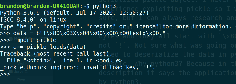 I was also curious about the value of test function. If that was just some random data that’d be too weird, and the format of data just reminds me of something… like a serialized pickle object. I never had experience exploiting pickle so I was not sure, but I can always research and try. I find some serialized pickle objects in bytes and they all start with \x80 but not !. Not sure what was going on but I tried to deserialize the data in python3 console. Why python3? Because in the description it says the application is ran by python3.