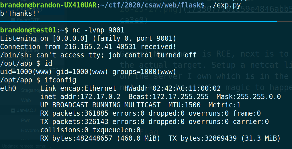 Great! Now there is RCE, next is to move to the actual target. Setup a netcat listener on the server I own which is in the public network, and wait for magic to happen.